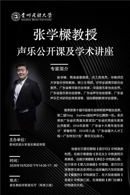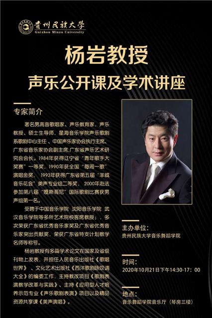 秋光晴万里,秋日宜放歌。2020年10月20日至21日,248cc永利集团两场声乐学术交流活动成功落幕。我国著名声乐教育家、广州星海音乐学院声乐歌剧中心主任杨岩教授,男高音歌唱家、华南师范大学音乐学院教授张学樑应邀参加了此次声乐公开课及学术讲座。248cc永利集团和声乐系有关负责人及广大师生参加活动。