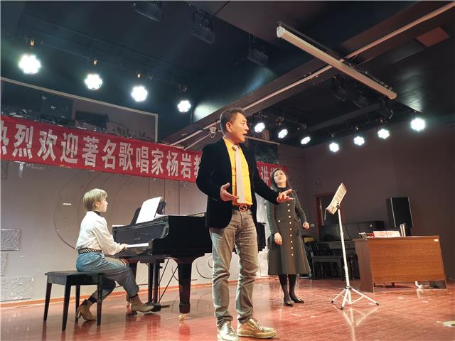杨岩教授和张学樑教授通过学院教师代表朱娆、李卿、罗洁周畅及学生代表杨洋、何骎骎、宋飞、宋青峰、刘东苹、张雯婕、杨一豪的演唱,着重从作品的音乐性处理进行了现场指导,作了深入浅出的阐述和生动形象地讲解,特别强调了读谱、语言的规范、钢琴伴奏等音乐修养的重要性。一个好的声乐老师应该尽可能地把自己塑造成一名“指挥家”兼“艺术指导”,“指挥”学生语言朗诵的抑扬顿挫,“指导”学生演唱的音准、节奏、语气和语调是否符合歌曲表达的意境,是否和钢琴伴奏相契合。杨岩教授和张学樑教授身体力行的示范演唱和极具感染力的“指挥式”教学,征服了现场的每一位听众,充分感受到了好声音的魅力。他建议老师和同学们一定要从重视语言的规范、节奏的把握、音乐术语的解读等方面去传情达意。