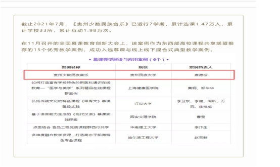 2021年11月,唐德松院长负责的国家一流课程《贵州少数民族音乐》在11月召开的全国慕课教育创新大会上,该案例在全国247个慕课典型建设案例的角逐评选之中脱颖而出,《贵州少数民族音乐》作为6个入选慕课与线上线下混合式典型教学案例之一成功入选。