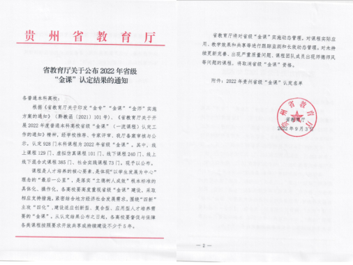 根据《省教育厅关于印发“金专”“金课”“金师”实施方案的通知》(黔教函(2021)101号)、《省教育厅关于开展2022年度普通本科高校省级“金课”(一流课程)认定工作的通知》精神,经学校推荐、专家评审、教育厅备案审核与公示,认定928 门本科课程为2022年省级“金课”。其中,线上课程129门、虚拟仿真课程101门、线下课程240门、线上线下混合式课程385门、社会实践课程73门。