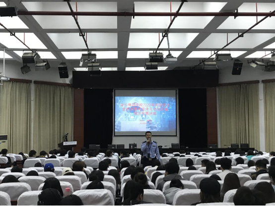 讲座正式开始后,赵普林警官用诙谐幽默的语言和真实的案例分析并讲解了电信诈骗的危害性,让诸位同学引以为戒,不要误入歧途,切身实地的从学生的角度去讲解了社会上的各种诱惑骗局。使同学们增强了网络安全意识,了解到相关的网络骗子行骗手段,使经常身处在网络虚拟世界的同学在应对网络诈骗做到“不听,不信,不转账”。随着时间的推移,两个多小时的讲座进入尾声,赵警官向广大师生敬礼告别,全场用掌声致敬赵警官。