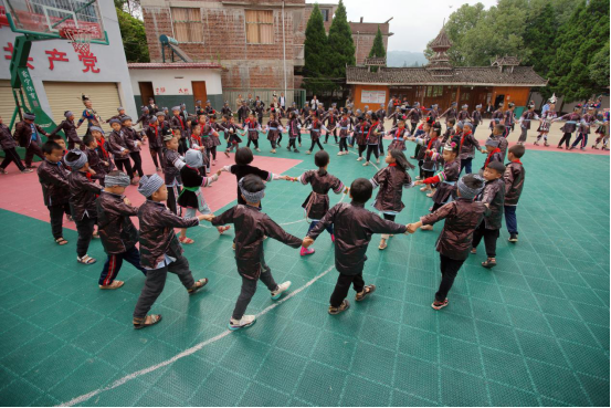 永利集团官网教育部中华优秀文化侗族大歌传承基地师生参观从江县高增乡小黄小学并与从江县高增乡小黄小学同学进行课间操《多耶》互动