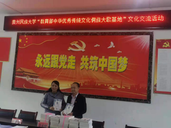吴文梅老师与黎平县岩洞中学吴承健校长举行图书捐赠仪式